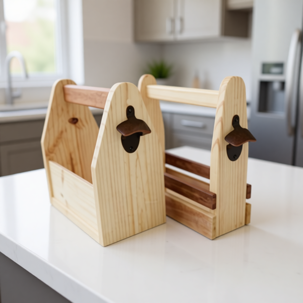 Lleva tus cervezas con estilo con esta caja de madera artesanal, diseñada para transportar, almacenar o presentar botellas de cerveza de forma cómoda y segura. Cuenta con un destapador incorporado en la estructura, lo que la convierte en un accesorio funcional ideal para reuniones, asados, picnics o como regalo para amantes de la cerveza.